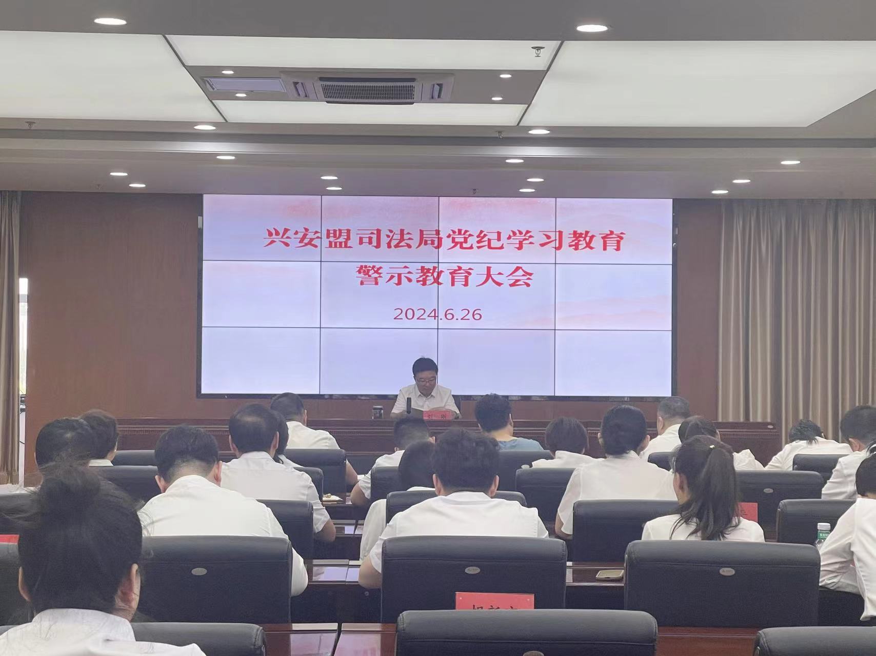 为推进党纪学习教育扎实开展,教育引导党员干部明法纪、知敬畏、存戒惧,6月26日,兴安盟司法局召开党纪学习教育警示教育会,兴安盟司法局党组书记、局长刘刚主持会议并讲话。盟纪委监委派驻政协机关纪检监察组组长张桂杰到会指导,局机关、直属事业单位全体人员,律师、公证、司法鉴定党支部党员代表参加会议。